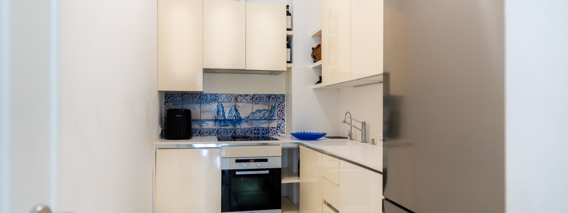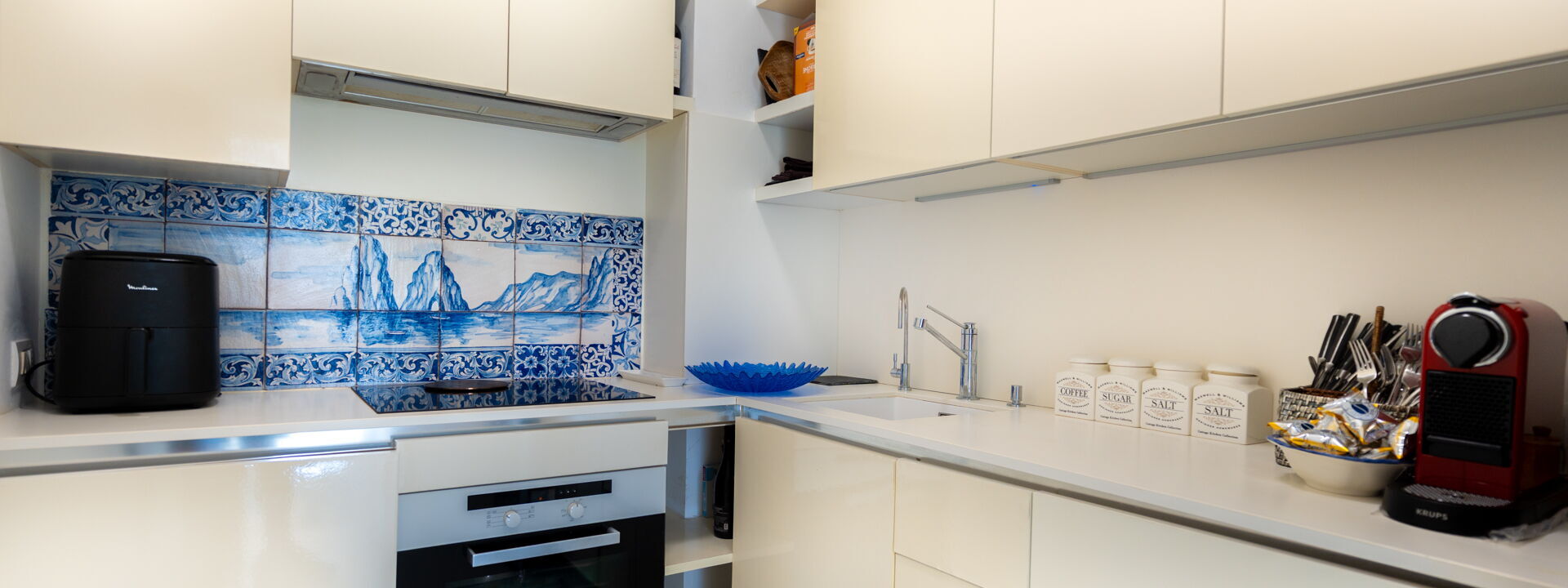 The fully equipped kitchen provides everything needed for preparing Mediterranean dishes, combining functionality with traditional island style.