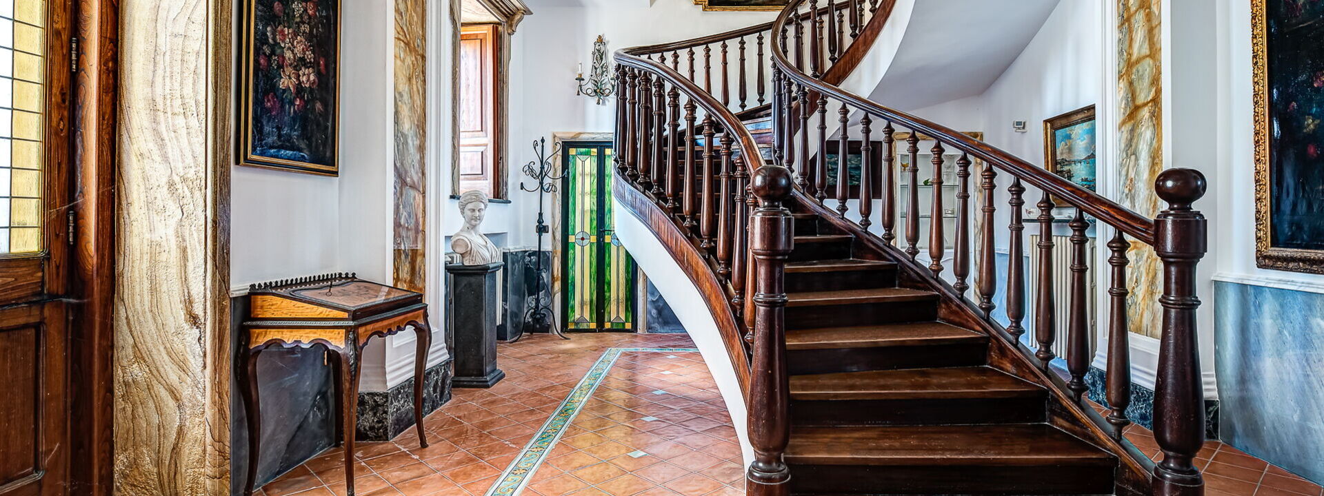 The ground floor entrance of the Villa opens onto the formal sitting room boasting a selection of wall high classical artworks and regal furnishings. The high ceilings and arched doorways of the villa add to the majestic feel that this villa emits. The large ornate wooden staircase, a main feature of the sitting room, spirals to the second floor of the villa where the sleeping quarters are located.