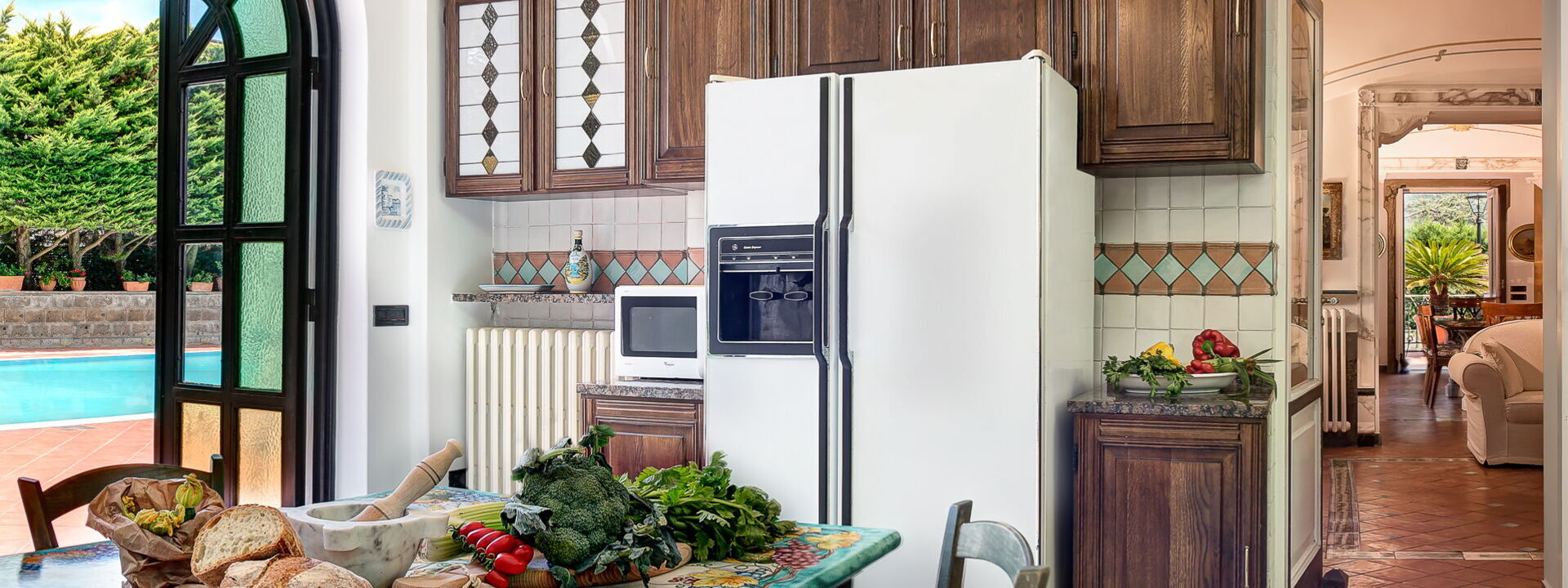 Returning to the ground floor of the villa, you will also find a spacious second sitting room and formal dining area cozily furnished with comfortable sofa chairs and a dining table for up to 8 people. The separate eat-in kitchen is well equipped with all the necessary appliances and equipment to explore South Italian flavours should you decide to organize a home chef or prepare your own sumptuous meals with some local organic produce. A small stairway from the kitchen leads to a lower level washroom with washing machine and ironing facilities and a bathroom.