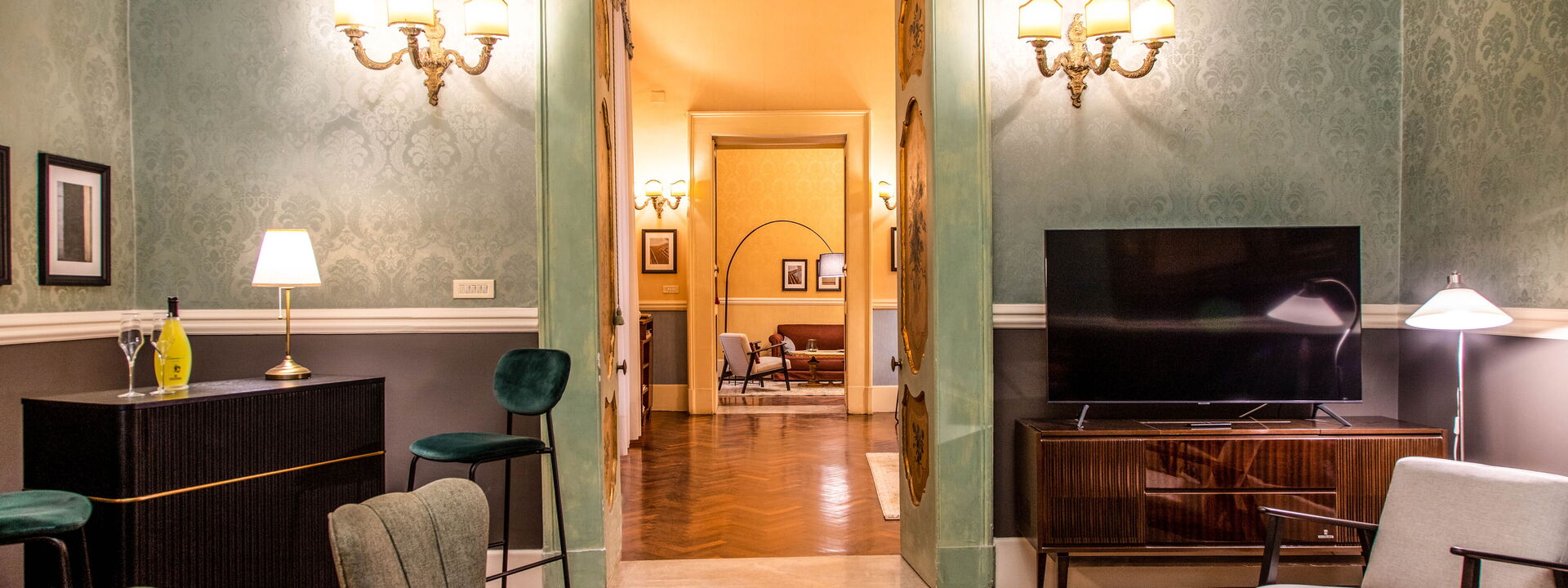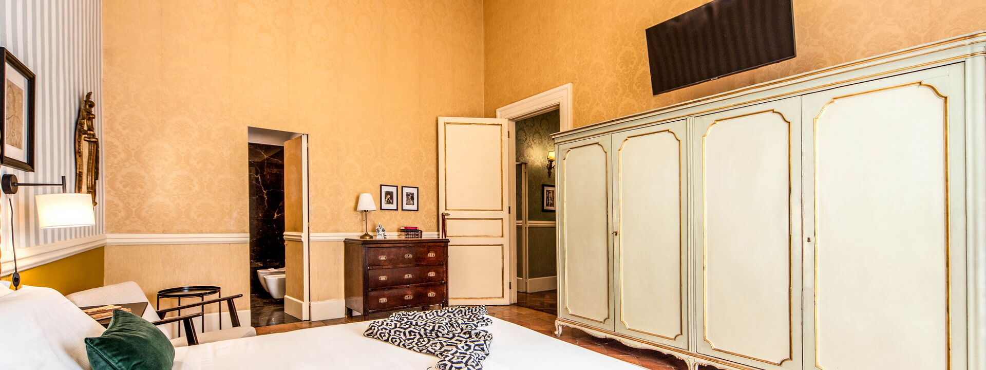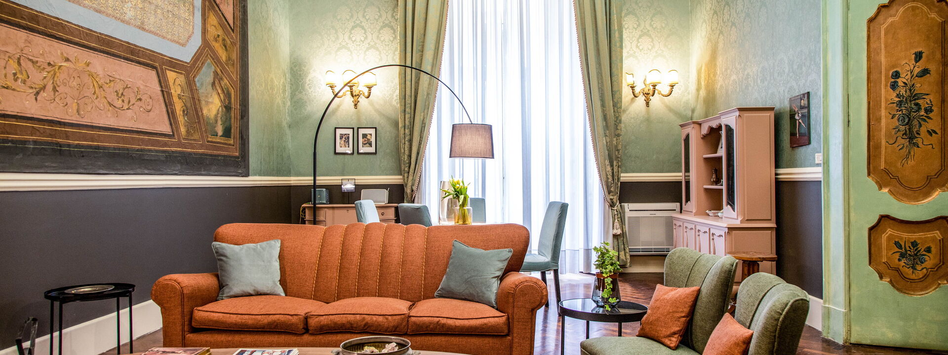 Reminiscent of the luxury and magnificence of a bygone era, all rooms in Tribunali Luxury Suite enjoy access to either an internal balcony overlooking the central courtyard or Via Tribunale. The apartment opens onto a small entry alcove which continues into the drawing room, furnished with books and antique wooden décor. From here you continue into the sitting room with two classical armchairs and a comfortable double sofa bed.