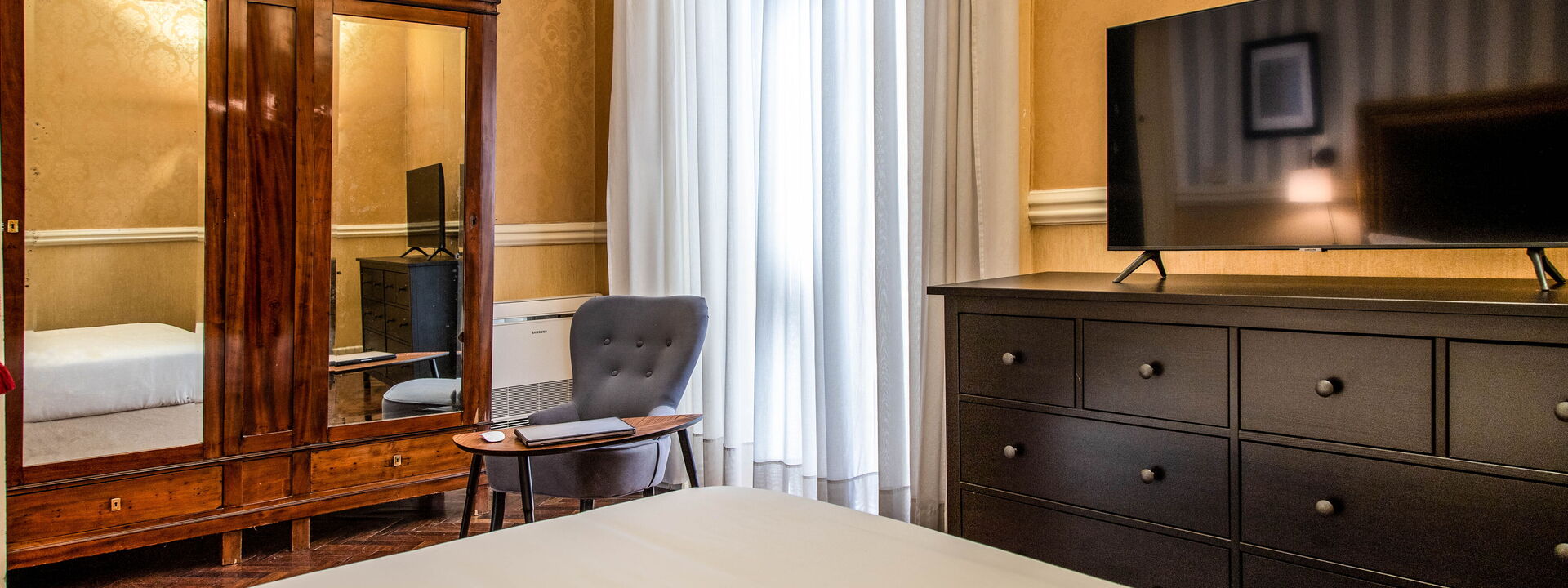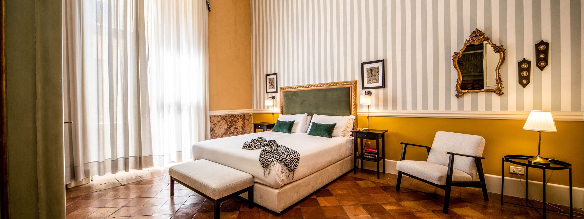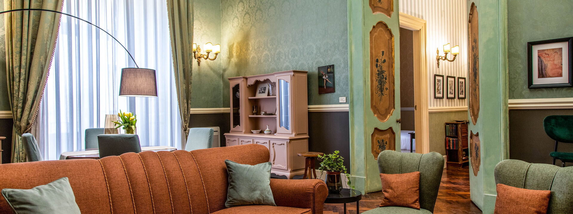 Reminiscent of the luxury and magnificence of a bygone era, all rooms in Tribunali Luxury Suite enjoy access to either an internal balcony overlooking the central courtyard or Via Tribunale. The apartment opens onto a small entry alcove which continues into the drawing room, furnished with books and antique wooden décor. From here you continue into the sitting room with two classical armchairs and a comfortable double sofa bed.