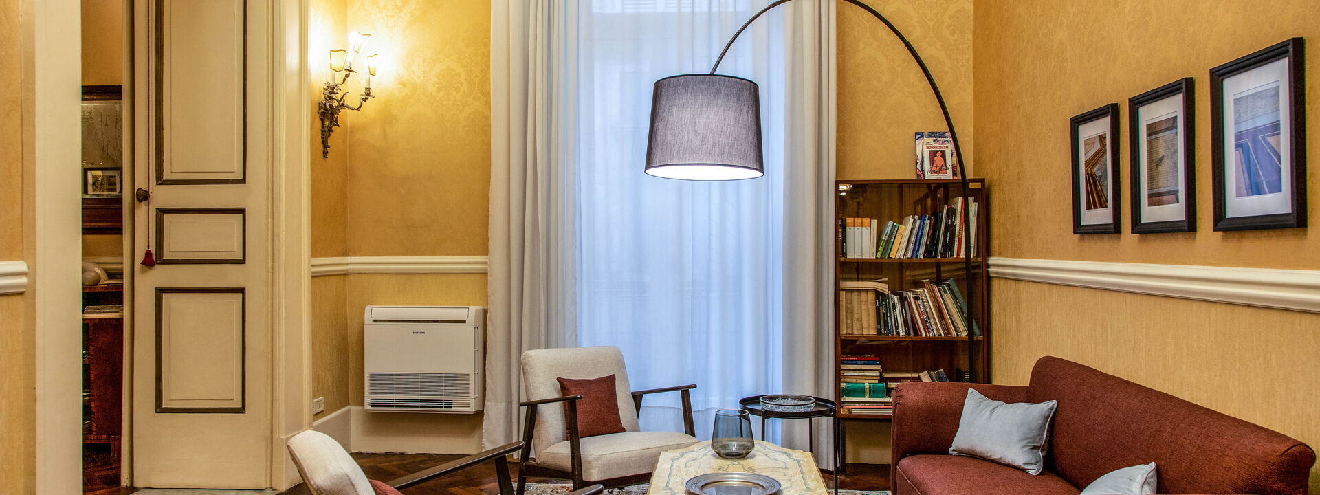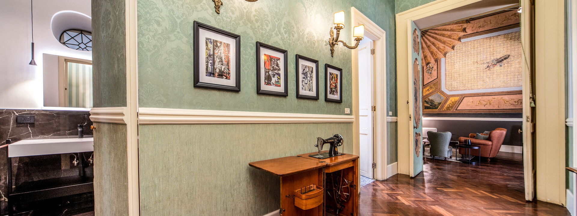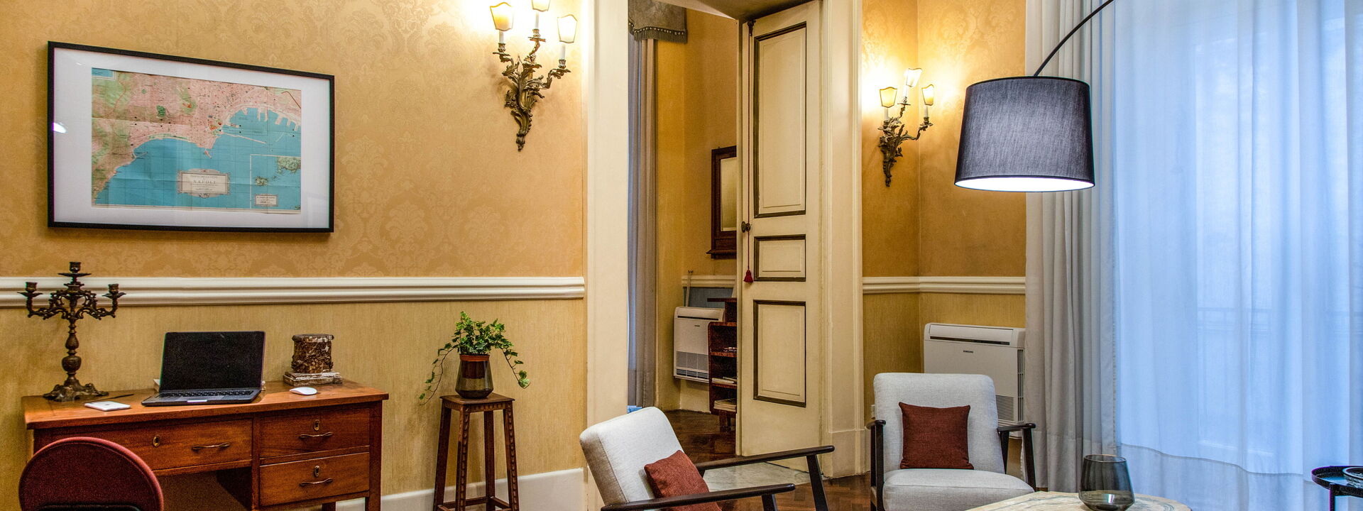 Each room is different both in size and décor, with period furniture and drapes of silk brocade. In addition, the apartment has a large picture gallery of works by the Neapolitan School and the Gruppo Sud, an art restoration organisation. Lamps and chandeliers are antique or rebuilt with original elements.