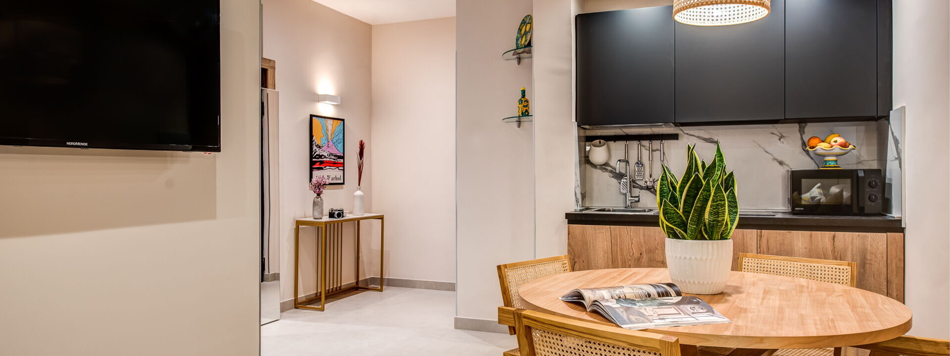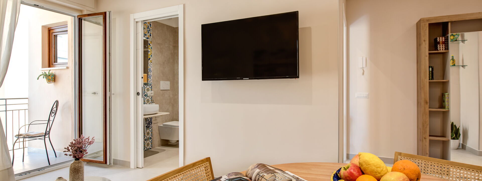 The main bedroom is tastefully furnished and consists of a double bed, ensuite bathroom, ample wardrobe space and a lovely furnished balcony. The entire apartment has been recently renovated, providing a modern and bright environment. Guests can enjoy all modern amenities, such as air conditioning, free Wi-Fi, and a flat-screen TV for their entertainment. What makes this one-bedroom apartment even more special are the two private terraces.