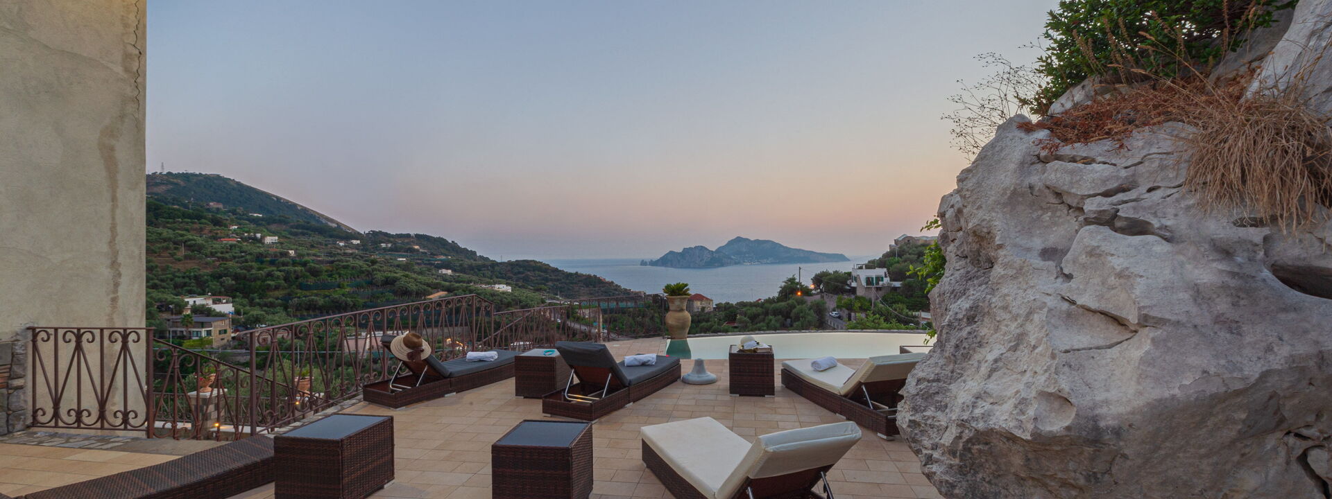 Step outside to be greeted by the spectacular infinity swimming pool, seemingly merging with the sea and sky. The panoramic sun terrace offers sweeping 180-degree views across the shimmering Bay of Naples to the enchanting island of Capri and the rolling green hillsides of Massa Lubrense. Cushioned sunbeds invite leisurely afternoons under the Italian sun, while the alfresco dining area provides the perfect setting for unforgettable meals beneath the stars.