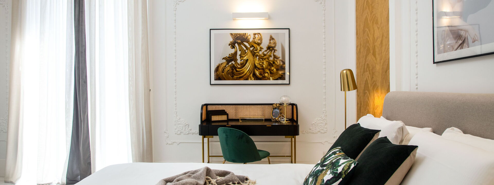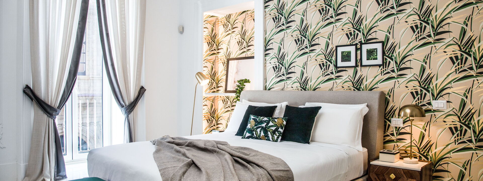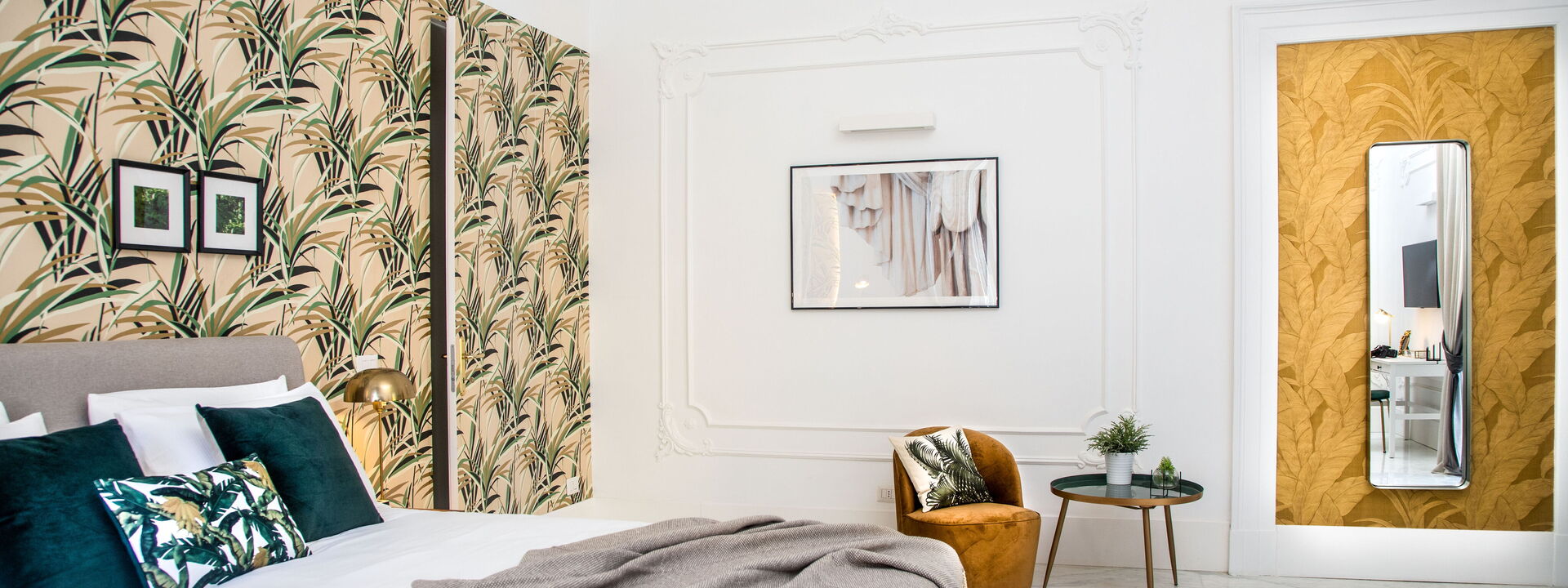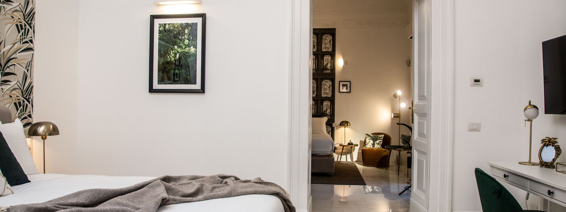 The bedrooms are spacious, bolstered by the high ceilings, and have been superbly designed to create a certain level of opulence with the use of diverse fabrics including wood, steel and velvet. The discreet green tropical theme displayed through both natural and artistic elements adds a calming feel in contrast to the busy metropolis of one of Italy’s most densely populated cities, only steps away.