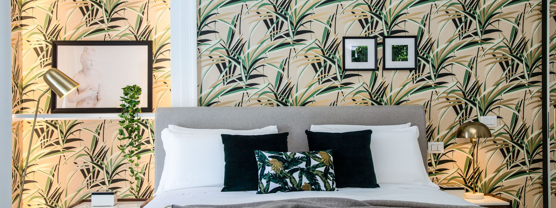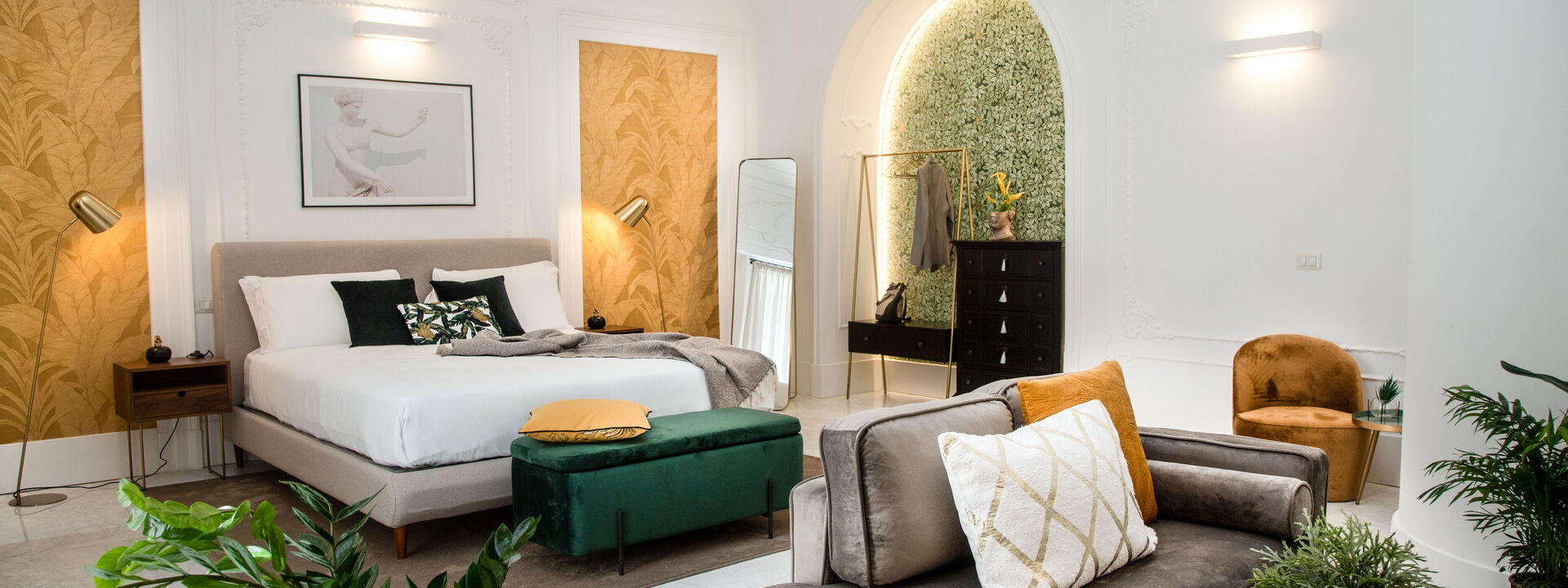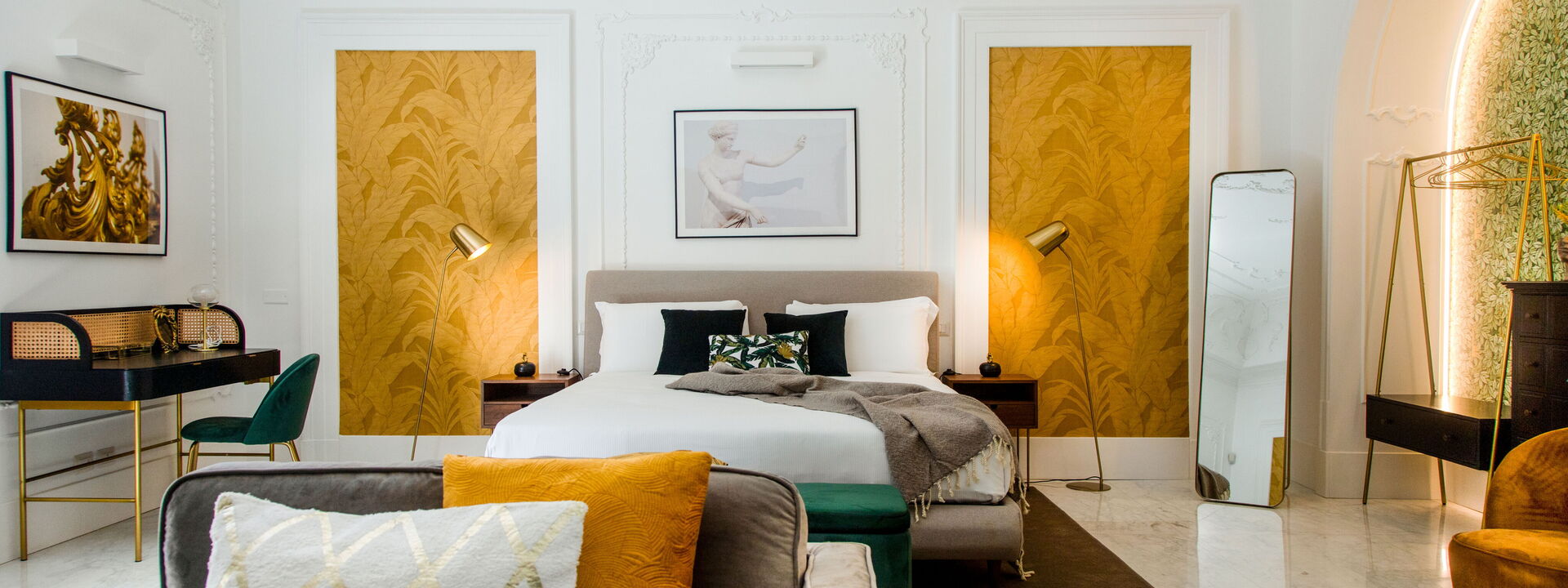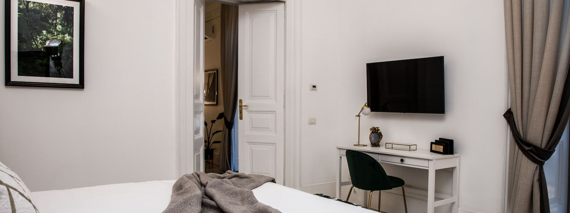 The bedrooms are spacious, bolstered by the high ceilings, and have been superbly designed to create a certain level of opulence with the use of diverse fabrics including wood, steel and velvet. The discreet green tropical theme displayed through both natural and artistic elements adds a calming feel in contrast to the busy metropolis of one of Italy’s most densely populated cities, only steps away.