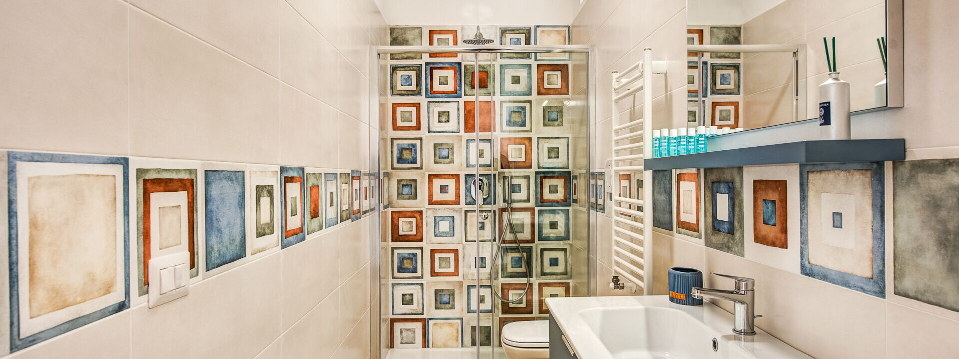 The bathroom is positioned adjacent to the two bedrooms and includes a walk-in shower with rain shower and handheld shower head, WC, bidet and wash basin.