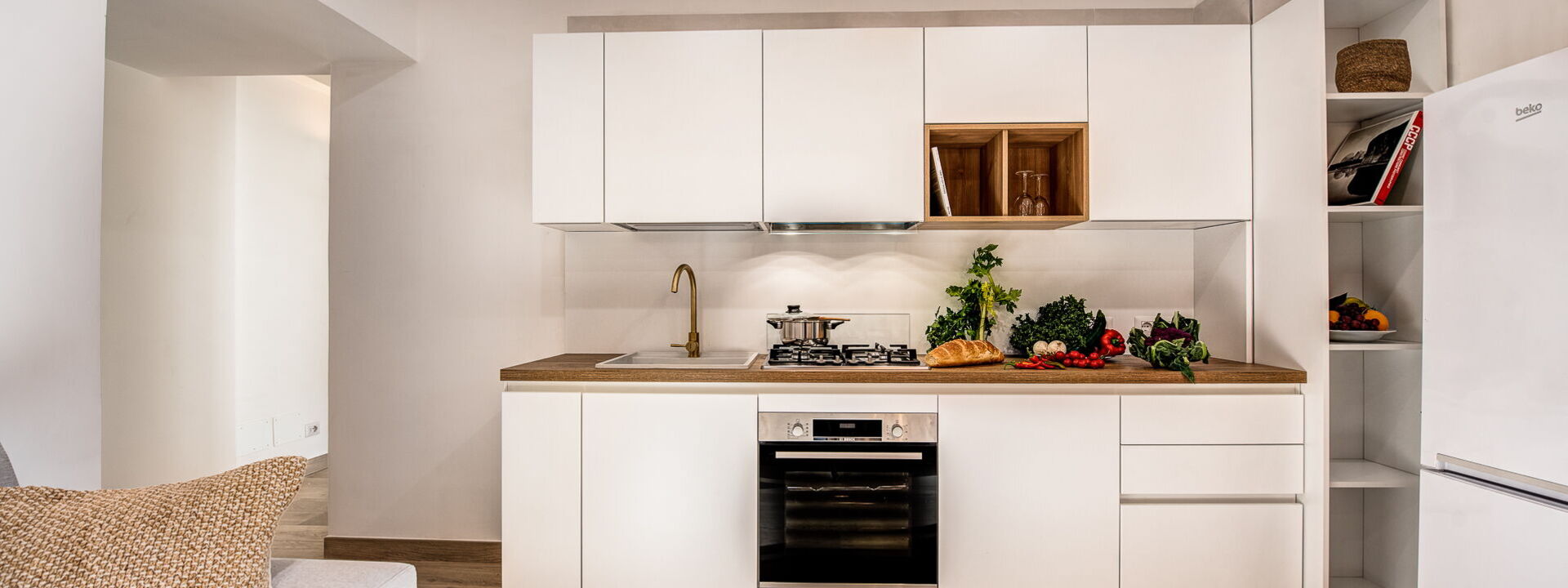 The kitchen is compact yet well-equipped and includes a 4-burner gas stove with oven, fridge/freezer and all the necessary utensils to prepare a home meal.