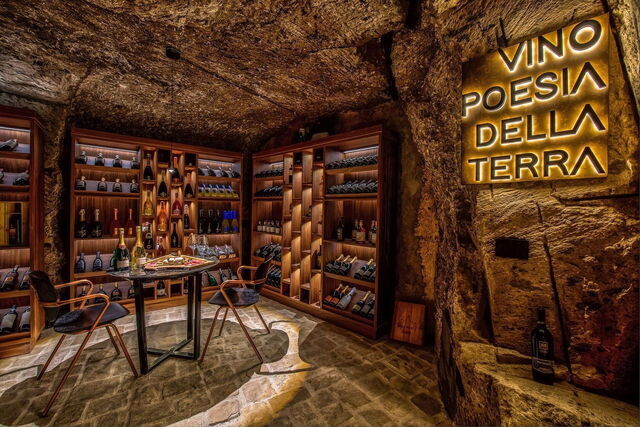 The Tasting Room: Descending to the second level, you are completely immersed in the magical atmosphere of "In Vino Veritas". Here, an intimate space is dedicated to wine tasting where our to be wine connoisseurs will take their time to savour a selection of local and Italian wines in the tranquillity of the earth's depths. The low ceiling and tuff walls provide unique acoustics, while discreet lighting highlights the displayed art and bottle labels.
