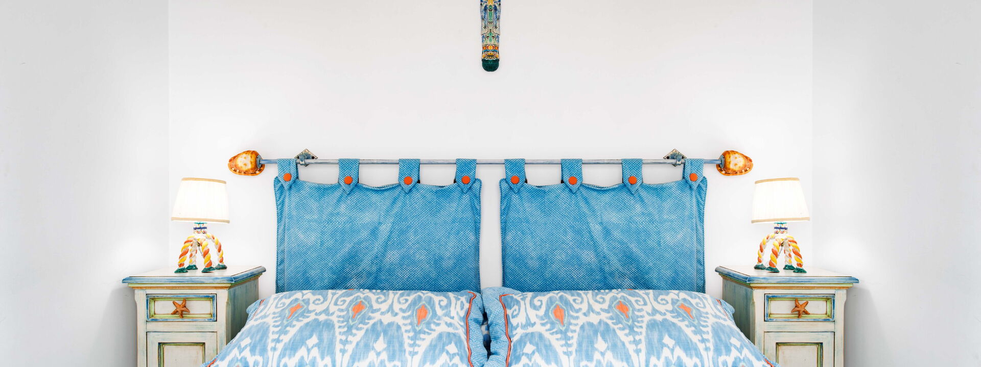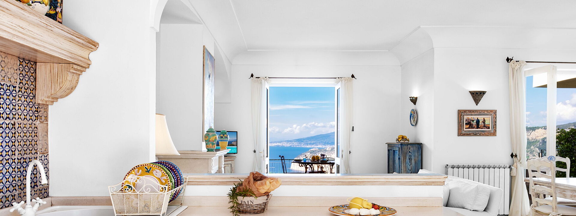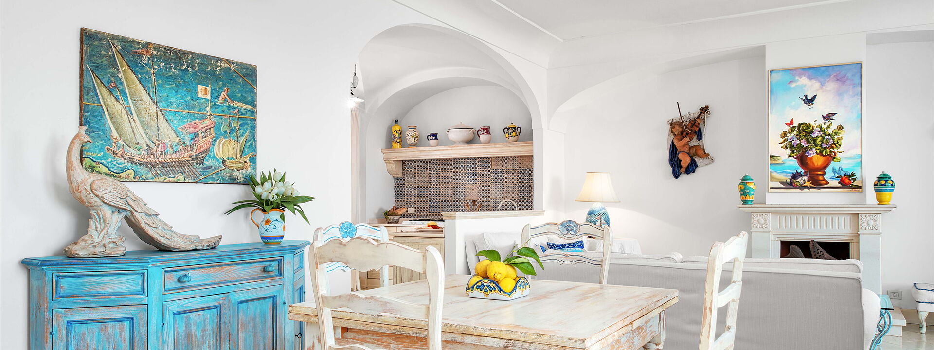 La villa è piena di carattere e personalità, con arredi scelti con cura e grande attenzione ai dettagli. I soffitti sono ad arco e dipinti di bianco, mentre una combinazione di colori blu e bianco richiama le tonalità del mare e del cielo esterni.