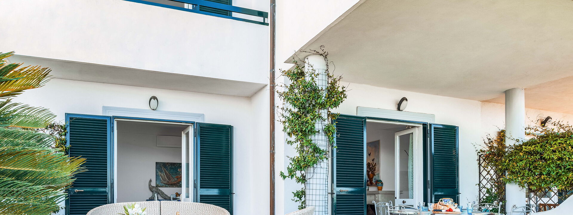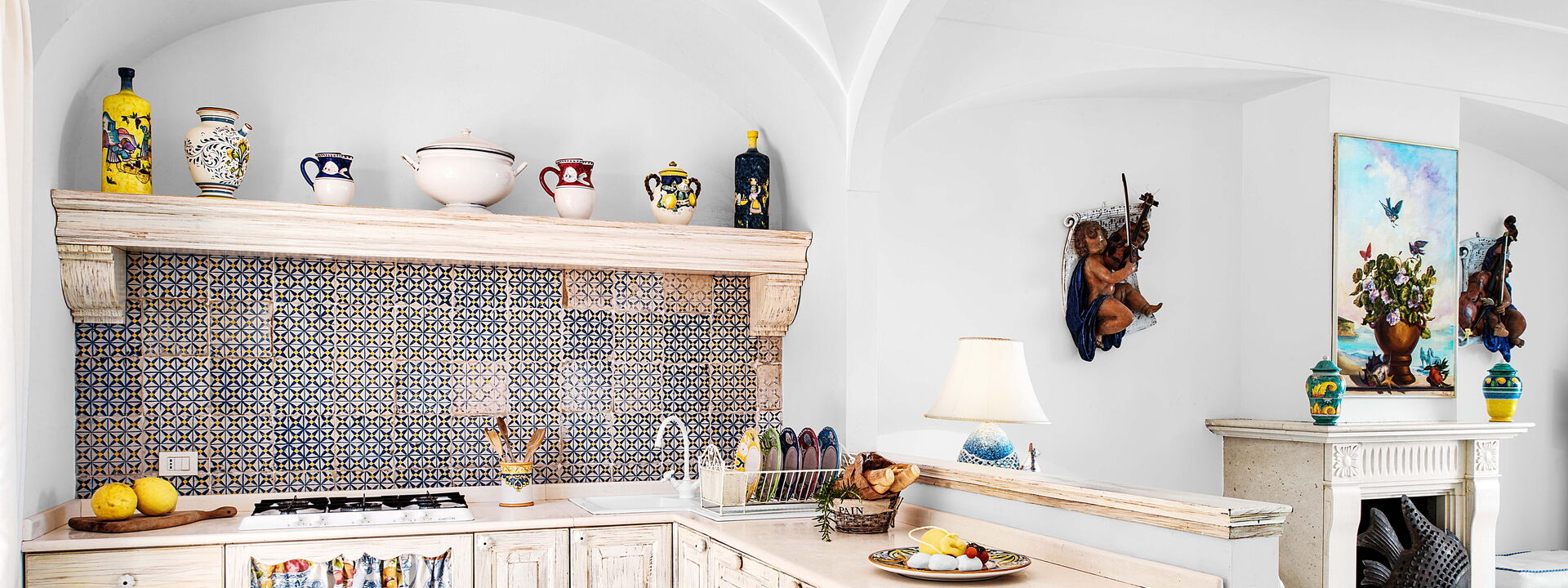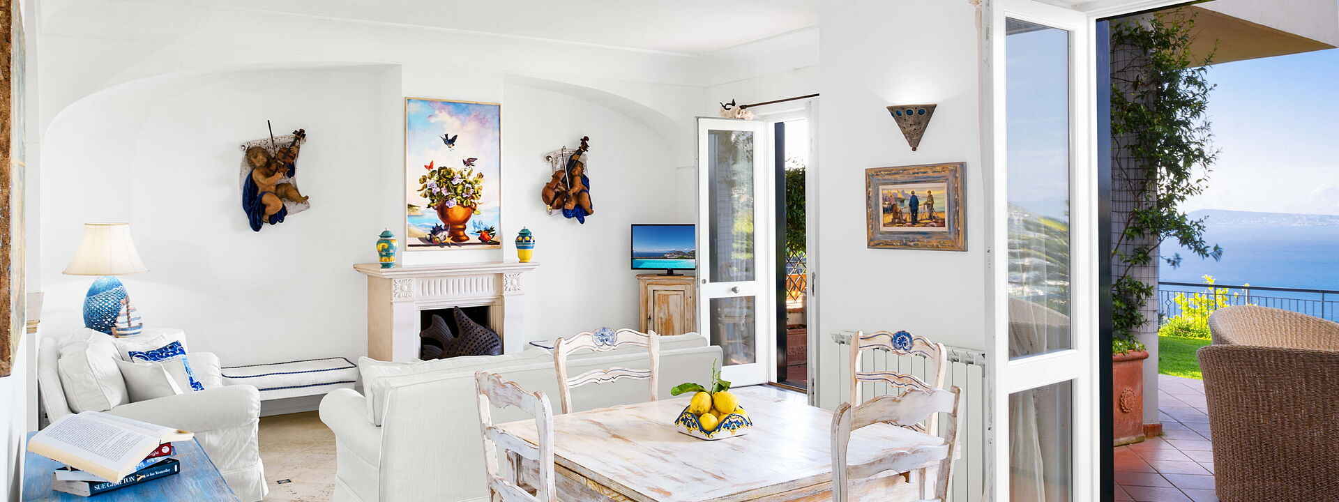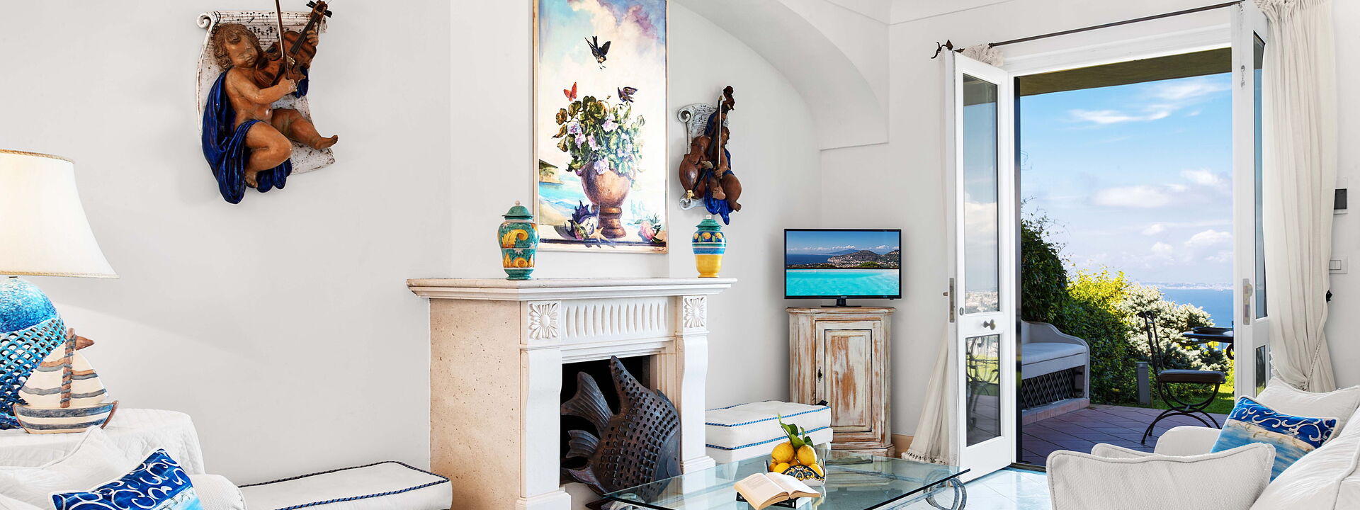 La villa è piena di carattere e personalità, con arredi scelti con cura e grande attenzione ai dettagli. I soffitti sono ad arco e dipinti di bianco, mentre una combinazione di colori blu e bianco richiama le tonalità del mare e del cielo esterni.