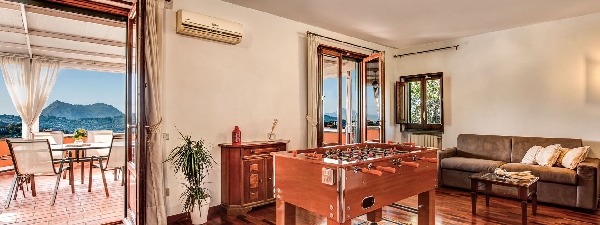 Al piano superiore, accessibile tramite scala interna, si trova la zona notte principale. Qui una spaziosa sala giochi/soggiorno offre un divano letto matrimoniale e un tavolo da gioco. Due porte finestre conducono a una terrazza con vista spettacolare sull’isola di Capri e sulla campagna circostante, arredata per cene all'aperto.