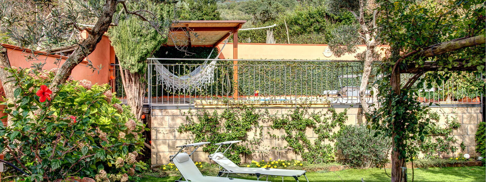 La villa ha due ingressi: il piano inferiore si apre su un patio arredato sotto pergolati di vite mediterranea, con accesso diretto a uno studio indipendente con letto matrimoniale e bagno privato, oltre a un appartamento con una camera da letto, soggiorno open-space, zona pranzo, angolo cottura e bagno separato.