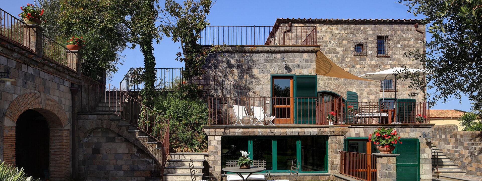 Attraverso la porta ad arco si passa nella sala da pranzo formale e in un secondo soggiorno / sala TV molto accogliente situato su un livello inferiore con pareti di roccia vulcanica (tufo) a vista.