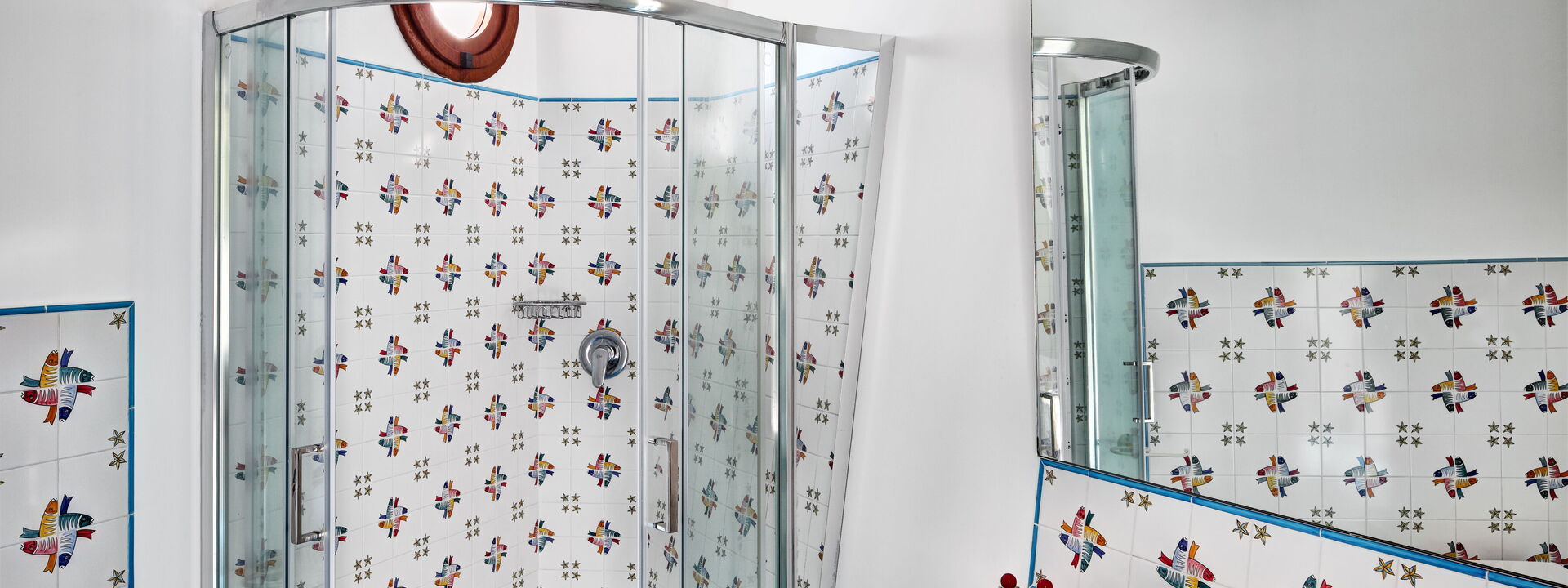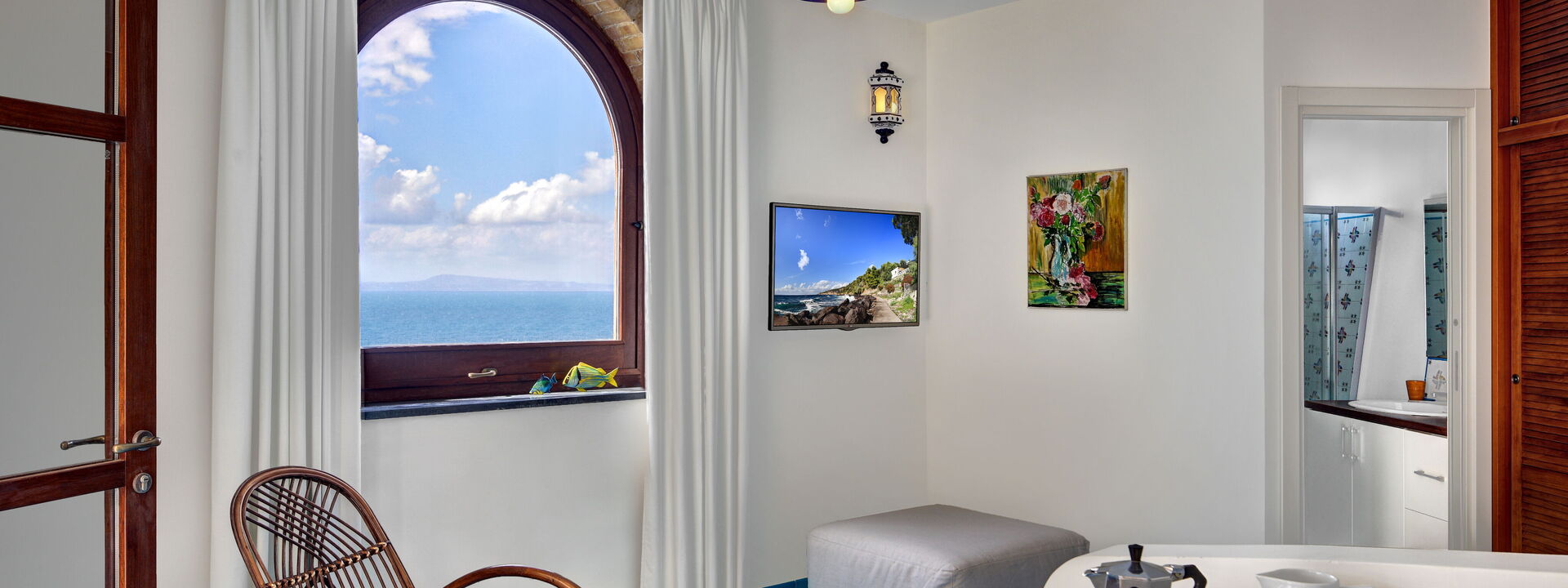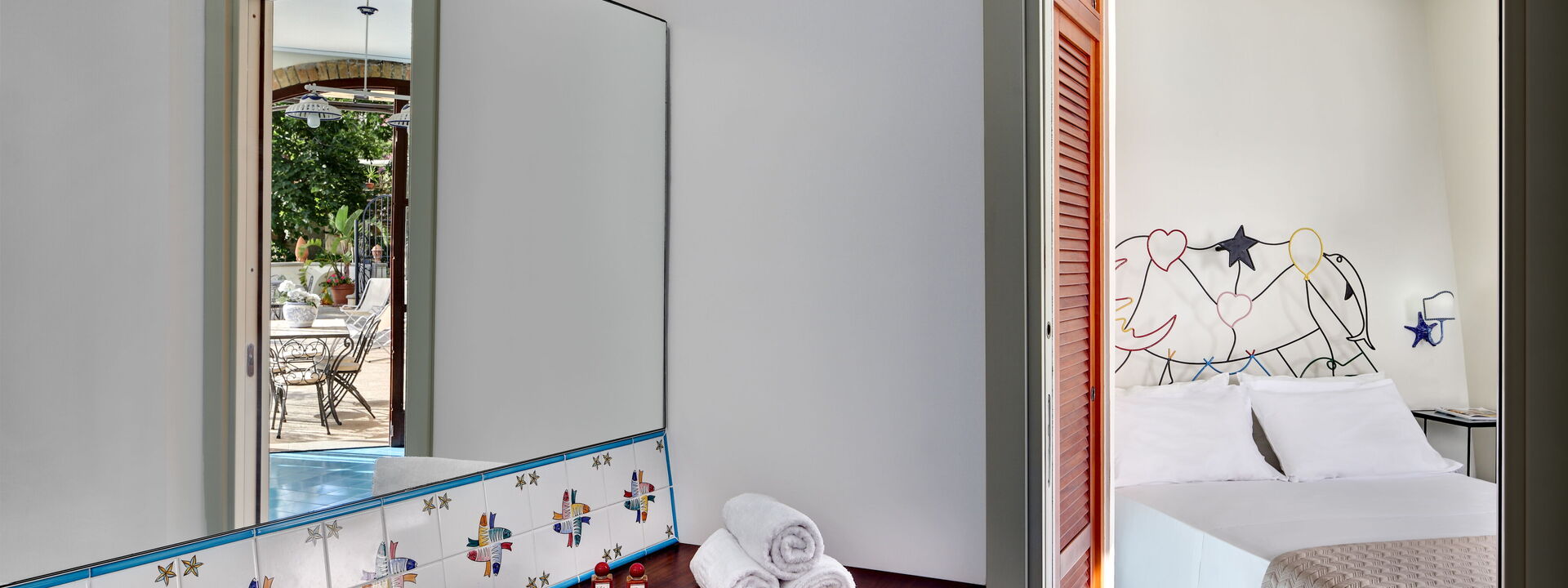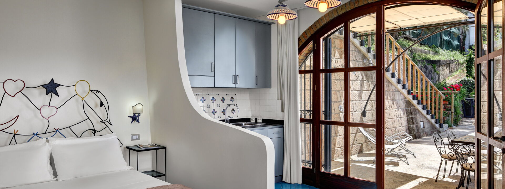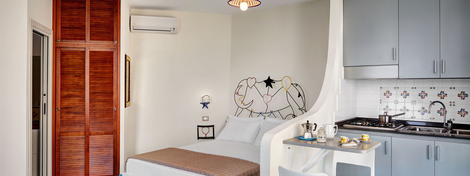 Vera ed il Vervece enjoys an open plan setting with kitchenette, living, dining and double bed. The dining table for two sits before an arched window with lovely views and there is a wicker rocking chair for relaxing in. The beautiful azure blue floor tiles throughout, echo the waters of the Mediterranean.