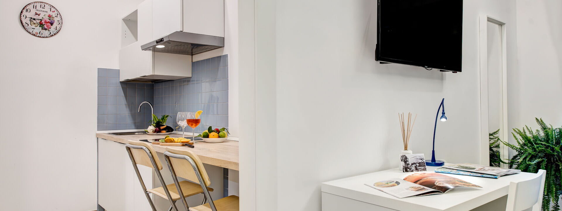 Dimoria Family Apartment consists of two double bedrooms, two bathrooms and two kitchenettes. Each bedroom is furnished with queen bed, desk, open wardrobe, and flat screen Satellite TV. The eat-in kitchenettes include induction stovetop, microwave oven and all the necessary equipment for preparing a light meal.